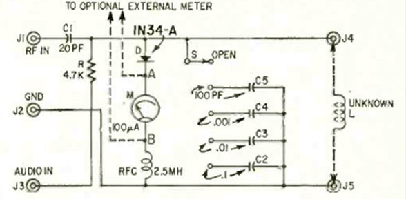 Este puente de inductancia utiliza una señal de audio externa. El circuito es de una radioelectrónica de enero de 1966. El instrumento puede ser un multímetro común en el rango de corriente más bajo.