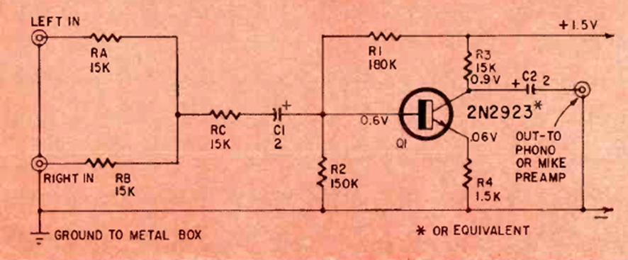 Este sencillo preamplificador de audio de 1 transistor apareció en la revista Radio Electronics de junio de 1968. El transistor es un tipo de propósito general de la época. La ganancia es de 14 dB.
