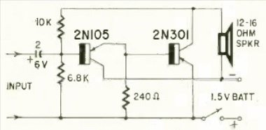 Este pequeño amplificador de 2 transistores fue encontrado en la revista Radio Electronics de mayo de 1959. El circuito se alimenta con tan solo 1 batería que proporciona una fracción de watt a pesar de tener un transistor de mayor potencia.