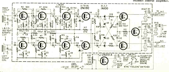 Se trata del circuito de un robot tipo “follow the line” con sensores inductivos publicado en la revista Radio Electronics en abril de 1961. El robot era un cortacésped, una novedad en la época.