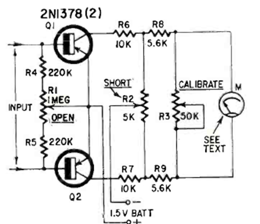 Este sensible medidor de corriente de dos transistores se encontró en la revista Radio Electronics de junio de 1964. Se pueden utilizar transistores modernos de uso general. El circuito mide corrientes por debajo de 150 uA. El instrumento es de 15 uA.