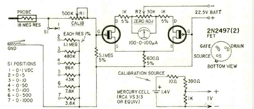 Este circuito se encontró en una Radio Electrónica de mayo de 1965. Los FET son de la época, pero el circuito se puede implementar con prácticamente cualquier FET. La precisión depende de las resistencias en los rangos seleccionados.