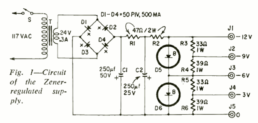 Esta fuente de alimentación de 4 voltajes mediante diodos zener tiene una corriente máxima recomendada de 25 mA. El circuito fue encontrado en la revista Radio Electronics de mayo de 1966.
