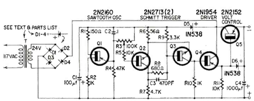 Utilizando 5 transistores, uno de los cuales es unijuntura, este circuito se encontró en la revista Radio Electronics de junio de 1964. Los transistores son de la época, pero se pueden probar equivalentes modernos, incluido el transistor unijuntura.