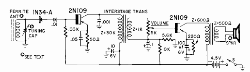 En la figura tenemos el diagrama de una radio de transistores simple para la banda de onda media. El circuito fue encontrado en la revista Radio Electronics de abril de 1960.