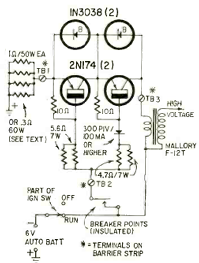Este circuito es para coches con Contact breakers y batería de 6 V. El circuito es de una Radio Electronics de enero de 1965. Los transistores de potencia y los diodos zener son tipos de la época.