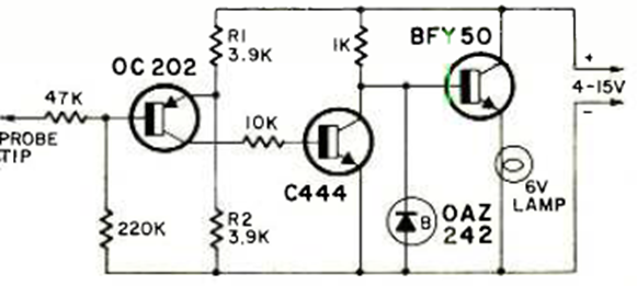 Este circuito es de una Radio Electronics de febrero de 1970. El circuito tiene una lámpara como indicador, pero se puede hacer con LED y transistores modernos. A 5 V el circuito es compatible con TTL.