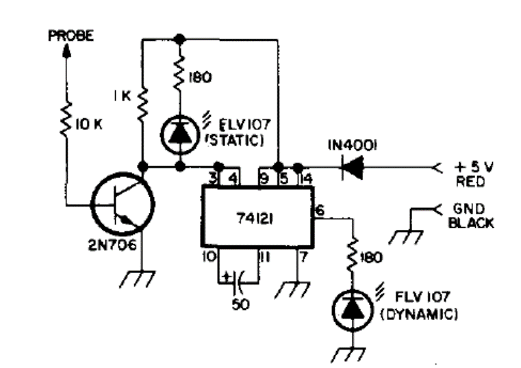 Encontramos esta configuración en una documentación técnica de 1974. Puede probar tanto circuitos lógicos TTL como versiones anteriores como RTL. El circuito debe alimentarse con 5 V obtenidos del circuito que se está analizando. El transistor podría ser el BC548.