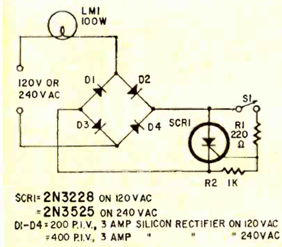 Este circuito se obtuvo de una revista de Radio Electronics de junio de 1969. El circuito utiliza potencia SCR según la carga y los diodos deben tener la misma capacidad de corriente.
