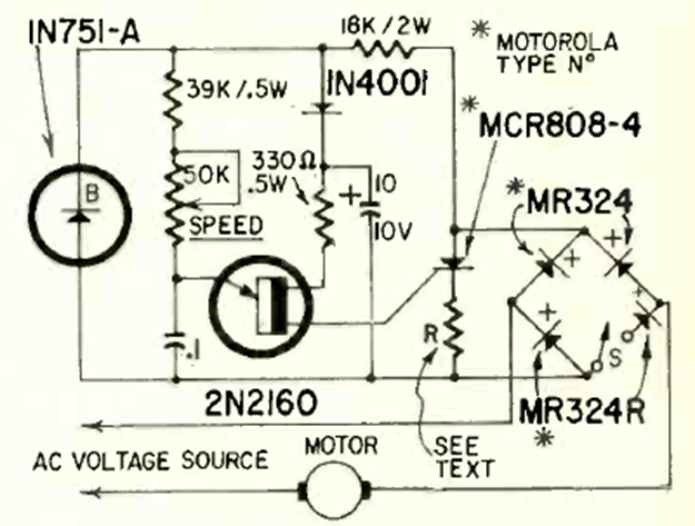 Este circuito es de Radio Electronics de abril de 1964. Tenga en cuenta el transistor unijuntura de la época, así como el SCR de Motorola. El circuito es para motores de 2 A conectados a la red de 117 V del momento en Estados Unidos.