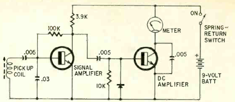 Este circuito lo encontramos en una Radio Electrónica de octubre de 1965. La bobina captadora puede ser del tipo telefónico y el instrumento es un micro o miliamperímetro que preferiblemente debe tener una resistencia limitadora de corriente en serie.