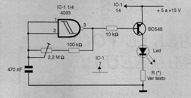 Este circuito excita un LED, que parpadeará a una frecuencia ajustada por el trimpot. Los otros puertos del mismo circuito integrado se pueden utilizar en configuraciones similares. El resistor R será de 470 ohms para un suministro de 3 a 6 V, 680 ohms para un suministro de 9 V y 1k ohms para un suministro de 12 V.