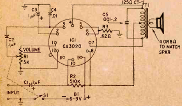 Este es un amplificador con uno de los primeros circuitos integrados disponibles, el CA3020 que fue fabricado por RCA; El pequeño amplificador de audio que se muestra apareció en la revista Radio Electronics de abril de 1968 y tenía una ganancia de 58 dB con una potencia de unas pocas decenas de miliwatts