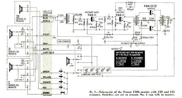 Este intercomunicador transistorizado comercial publicó este diagrama en la revista Radio Electronics en agosto de 1960. El circuito tiene varias ramas y proporciona los modos de conexión.