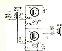 Esta etapa de potencia con transistores está estabilizada por dos lámparas. El circuito fue publicado en la revista Radio Electronics en abril de 1962. No se indicaban los transistores ni la potencia.