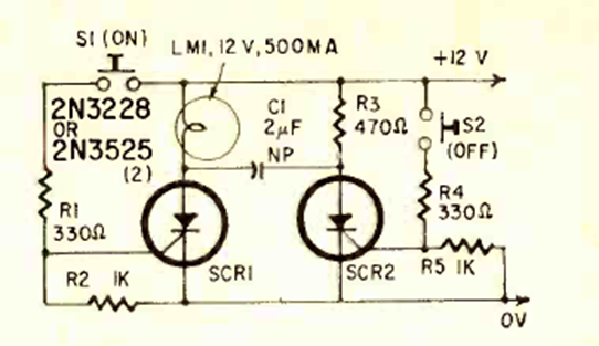 Este circuito es de una revista de Radio Electronics de junio de 1969. El circuito utiliza dos SCRS para encender y apagar una lámpara con dos interruptores. La tensión de alimentación depende de las lámparas.