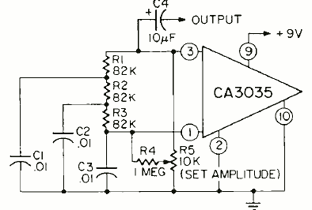 Este oscilador de 1 kHz se encontró en la revista Radio Electronics de febrero de 1970. Utiliza un amplificador operacional CA3035 lanzado recientemente por RCA. Los componentes de doble T se pueden cambiar a otras frecuencias.