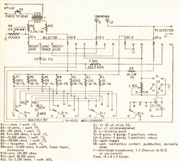 Este circuito de banco sin componentes activos apareció en la revista Radio Electronics de agosto de 1958; El circuito tiene varios rangos de medición de resistencias, capacitancias e inductancias.