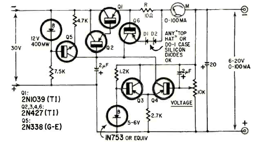 Esta fuente de 6 a 12 V con corriente de hasta 100 mA fue encontrada en la revista Radio Electronics de junio de 19666. La fuente tiene un indicador de corriente y utiliza transistores de la época.