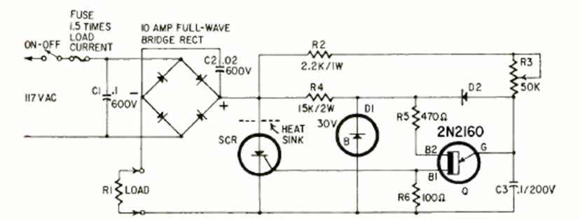 Este control de potencia con SCR se encontró en Radio Electronics desde abril de 1966. Los componentes son de la época, pero el circuito se puede implementar con equivalentes modernos. Los diodos deben tener corriente según la carga.