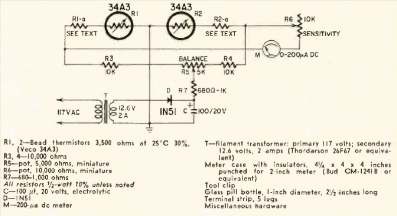 Este circuito fue publicado en la revista Radio Electronics de agosto de 1958 que enseñaba cómo montarlo. El circuito dispone de dos termistores como sensores, midiendo la humedad por evaporación en uno de ellos.