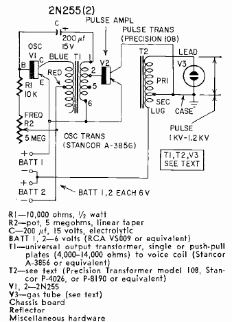Este circuito, encontrado en una revista de Radio Electronics de marzo de 1950, utiliza una lámpara de neón de alta potencia común en la época. La alimentación se suministra con baterías.