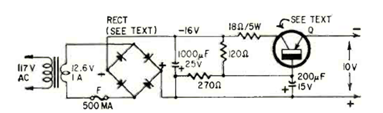 Este eliminador de batería de 9 V fue encontrado en la revista Radio Electronics de junio de 1966. El transistor es de potencia media y debe estar equipado con un pequeño disipador de calor.