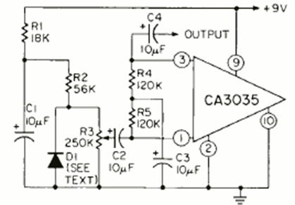 El amplificador operacional es un tipo lanzado en su momento por RCA. El circuito es de una revista de Radio Electronics de febrero de 1970. La fuente de ruido es un diodo.