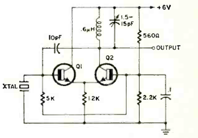 Este oscilador para el quinto armónico de un cristal se encontró en una revista de Radio Electronics de mayo de 1970. Los transistores son del tipo RF y el transistor determina la frecuencia máxima alcanzada.