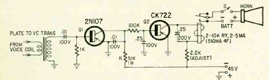 Este circuito activa una bocina mediante una señal de audio. Esto se puede utilizar para control remoto a través de señales de audio. El circuito es de una Radio Electronics de octubre de 1965.
