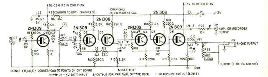 Este circuito muy complejo en cuanto al número de transistores se encontró en Radio Electronics a partir de marzo de 1966. El circuito es para auriculares de baja impedancia. Los transistores son de la época.