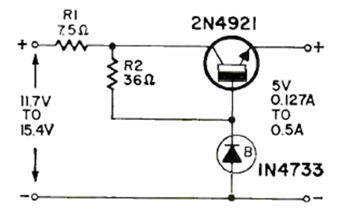 Hallado en un Radio Electronics de agosto de 1969, este circuito reduce una alta tensión para 15,4 y después a 5 V con un transistor de potencia que debe estar equipado con un radiador de calor.