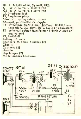Este circuito fue encontrado en la revista Radio Electronics de junio de 1961. La distancia entre estaciones está limitada por pérdidas en los cables. La alimentación es a través de batería.