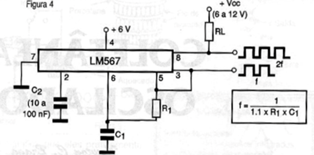 El LM567 es un decodificador de tonos PLL que también se puede utilizar como oscilador dual, como se ve en el circuito de la figura. La tensión de alimentación debe estar entre 5 y 10 V y la frecuencia máxima de funcionamiento debe rondar los 100 kHz. Los valores de los componentes en función de la frecuencia a generar se pueden calcular mediante la fórmula que figura al lado del diagrama. Tenga en cuenta que la forma de onda de la señal es rectangular y una de las salidas tiene el doble de frecuencia que la otra.