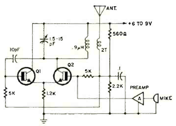 Este interesante circuito de emisor acoplado se encontró en la revista Radio Electronics de mayo de 1970. El circuito tiene un alcance de unas pocas decenas de metros. El preamplificador de micrófono no está incluido, pero se puede utilizar un electreto.
