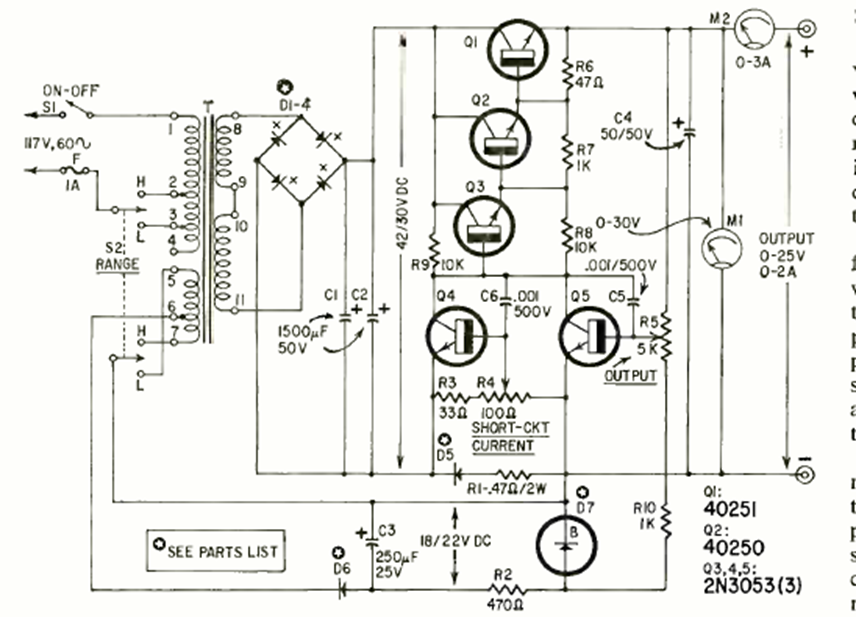 Este circuito con transistores de silicio se encontró en aquella época en la revista Radio Electronics de junio de 1966. El transistor Q1 debe estar equipado con un buen disipador de calor. La revista describió su montaje completo en un artículo.
