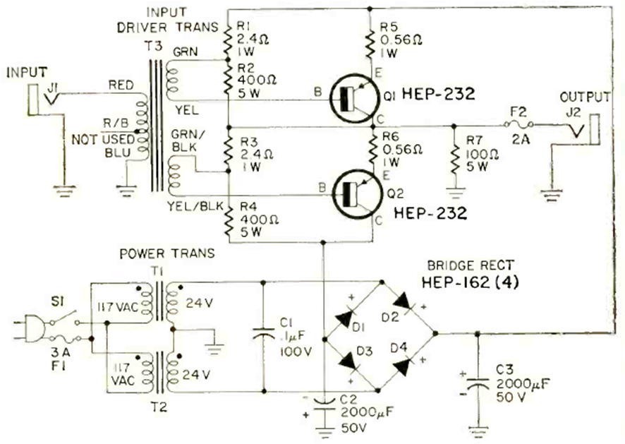 Esta etapa de potencia con transistores PNP se encontró en la revista Radio Electronics de mayo de 1969. El circuito utiliza un transformador de excitación y necesita una entrada de 10 W para obtener una potencia de salida total.