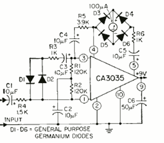 Encontramos este circuito en la revista Radio Electronics de febrero de 1970. Puede usarse en una computadora analógica como indicador nulo en el caso de señales alternas.