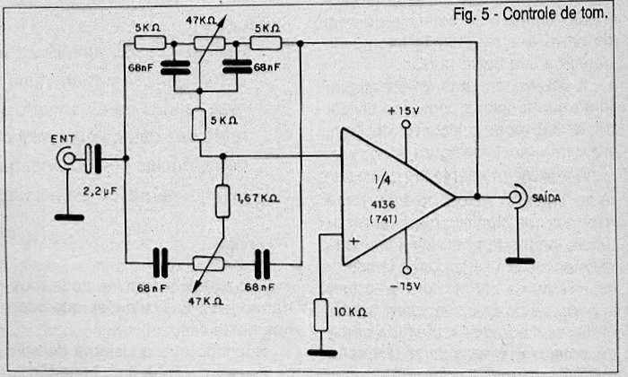 La base de este circuito es 1/4 de un circuito integrado 4136 que en realidad consta de un 741 cuádruple. Podemos usar el 741 para una versión mono, o el original para una versión estéreo. La alimentación debe ser simétrica a 15 V y al tratarse de un circuito de audio, sensible a los ronquidos, se recomienda máximo cuidado con el diseño y las conexiones de entrada y salida de señal.