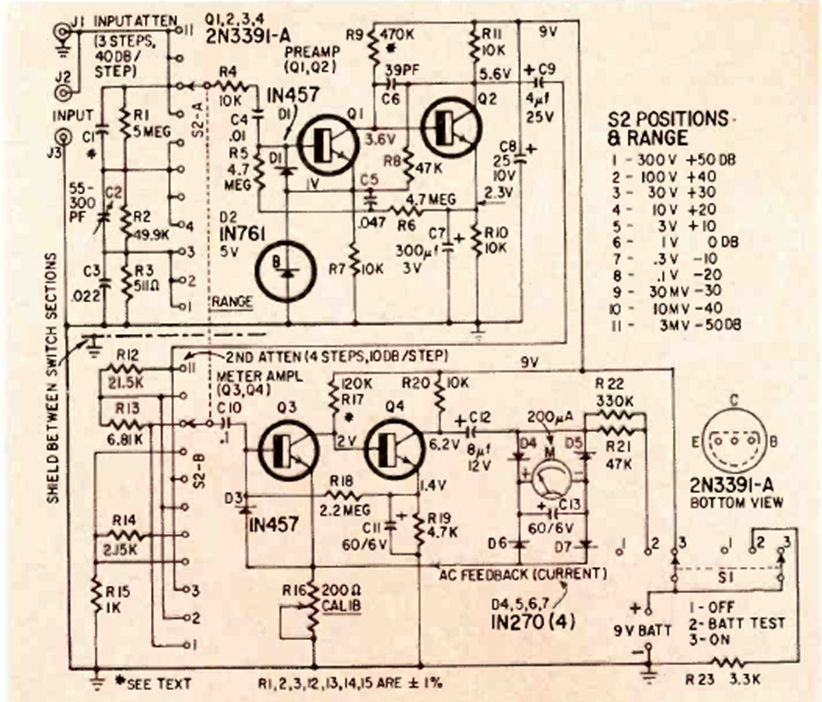 Este sofisticado circuito de voltímetro de audio se publicó en la revista Radio Electronics de marzo de 1966. Los transistores son de la época y el instrumento se puede reemplazar con la escala equivalente de un multímetro.