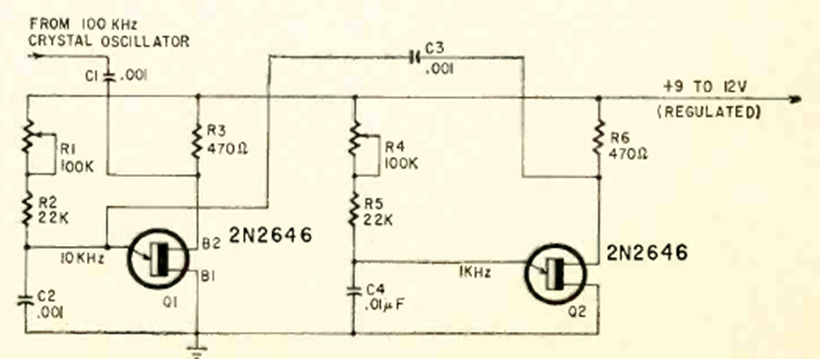 Este circuito de transistor unijuntura es un divisor de frecuencia sincronizado a 100 kHz. El circuito fue encontrado en una Radio Electrónica de julio de 1968. El ajuste de R4 es importante.