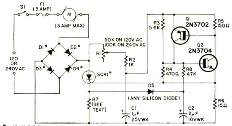 Este circuito simula un transistor unijuntura disparador con dos transistores bipolares. El circuito emplea diodos que deben tener la corriente según la carga. El circuito se utiliza para controlar motores universales o como atenuador.