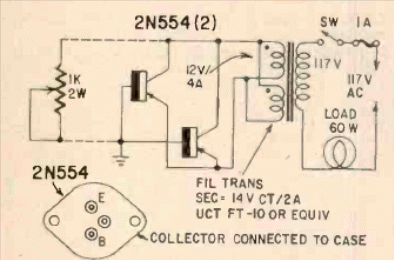 Este circuito se encontró en la revista Radio Electronics de enero de 1959. El transistor de potencia debe montarse en un disipador de calor. La carga máxima alcanza los 100 W.