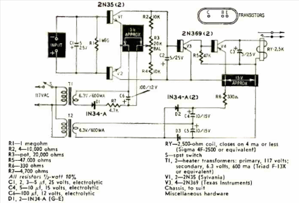 Este circuito de accionamiento de relé se encontró en la revista Radio Electronics de julio de 1958. Los transistores son contemporáneos y el relé es del tipo sensible a 9 V.
