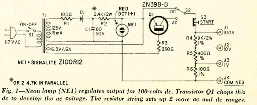 Este interesante circuito con una lámpara de neón y un transistor se encontró en la revista Radio Electronics de febrero de 1968. El transistor era un tipo especial de alta tensión en aquella época.
