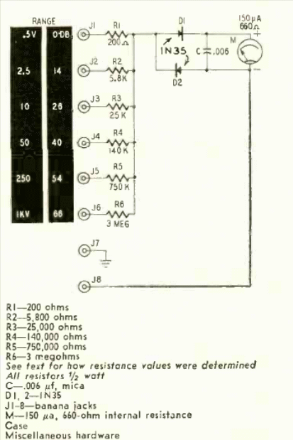 Este sencillo voltímetro aprovecha un instrumento de 150 uA. El circuito es de Radio Electronics de abril de 1958. Se pueden utilizar otros instrumentos con el recálculo de las resistencias de la red resistiva de entrada.
