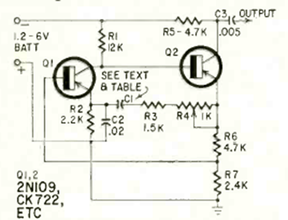 Este conocido circuito oscilador con dos transistores se encontró en la revista Radio Electronics de abril de 1964. Los transistores son de la época, como el CK722 y el 2N109, pero se pueden usar tipos modernos sin muchos cambios en los demás componentes.