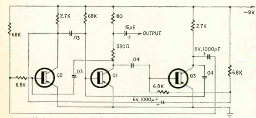 Este circuito genera un sonido de sirena. Fue encontrado en la revista Radio Electronics de abril de 1969. La señal de salida debe aplicarse a un amplificador externo.