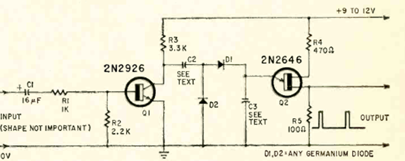 Este circuito con el 2N2646 se encontró en una Radio Electrónica de julio de 1968. El circuito produce pulsos según la señal aplicada a la entrada. La frecuencia depende básicamente de C3.