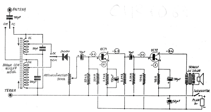 Este receptor para dos bandas de ondas se encontró en documentación de los años 70. Los transistores originales están hechos de germanio, pero se pueden hacer cambios para utilizar transistores de silicio modernos como el BC558 o incluso el BC548, invirtiendo la polaridad de la fuente de alimentación. Las bobinas están formadas por 20+80 vueltas para ondas medias y 5+25 vueltas para ondas cortas, con hilo 28 sobre una varilla de ferrita. La antena debe ser larga y el transformador de salida es del tipo que se encuentra en las radios de transistores más antiguas.